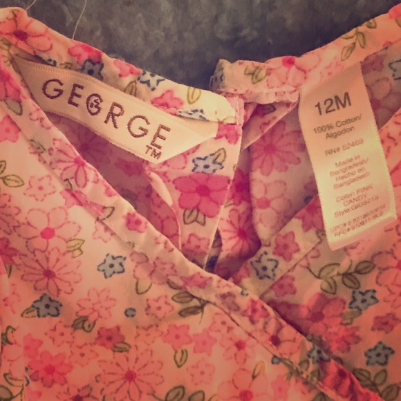 This dress features pink and blue flowers with green stems and leaves against a white background. There is an accent of ruffles which usually need to be ironed for a more polished look. The dress buttons in the back. 100% cotton, machine washable, excellent condition.