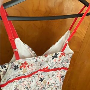 White floral summer dress. Adjustable spaghetti straps. White with blue, red, cream and purple.