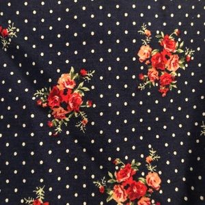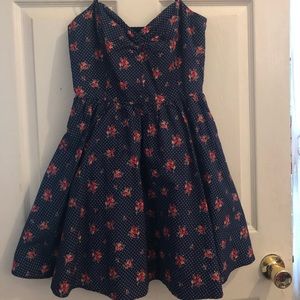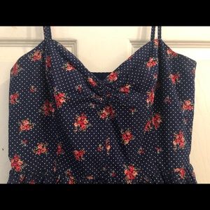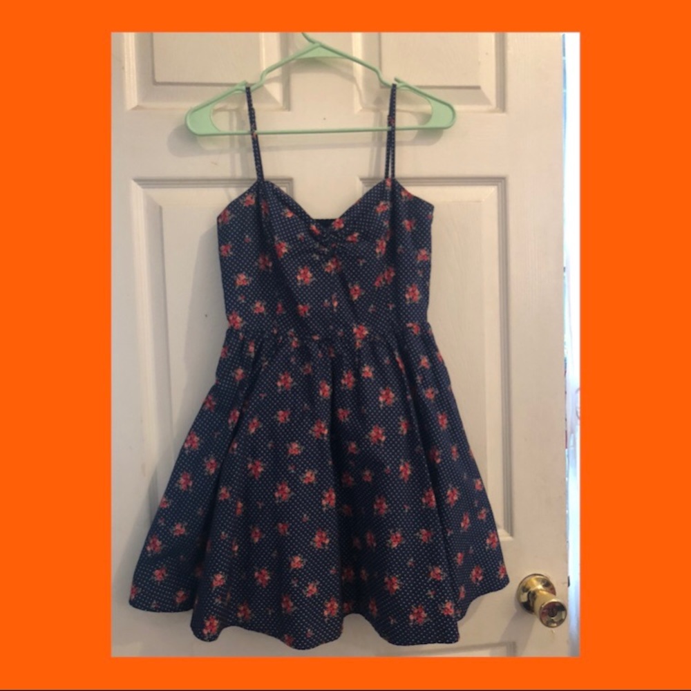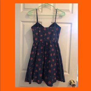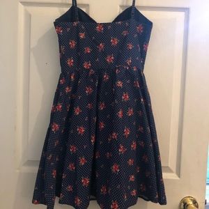 Cute sundress in pretty floral print - deep navy blue base with floral accents and white dots. Thin straps and a sweetheart neckline with A line skirt. The skirt has a lining underneath which gives it good volume. Size small!
