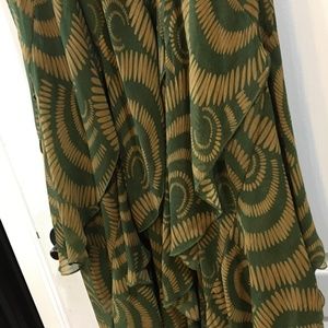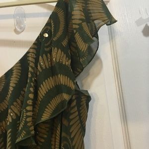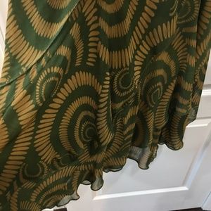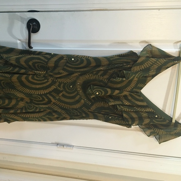 Beautiful sleeveless beaded and sequined flounce dress. Dress is form fitting and flares over the hips into a flounced skirt. Very flattering with a skirt that moves as you do. The color is a olive green with tan geometric design intermittent with gold beading and sequins. Dress was worn one time. It is 100% polyester; tag suggests hand washing, cold water, line drying.