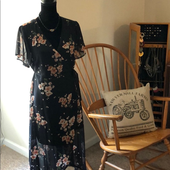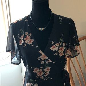 Beautiful, silky wrap dress with side tie. Short, flutter sleeves. Lined to the knee but top layer of dress is below the knees and drapes longer to the back. Pretty pink and white floral design. (Necklace not included).