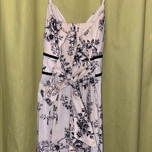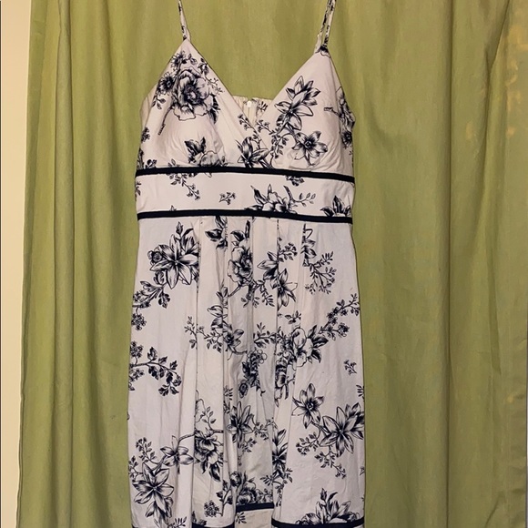 Cream colored sundress with black floral pattern. Built in bra pads and adjustable straps. It’s hard to get the lighting right to show how nice the cream color really is. A very flattering dress