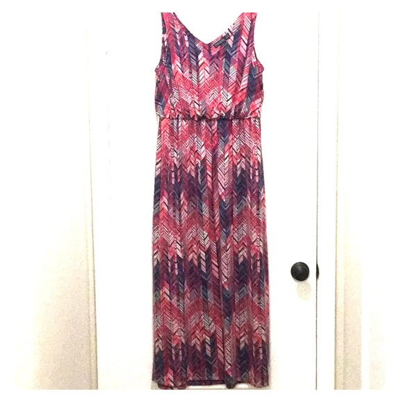 Printed sundress of polyester/spandex with cinched elastic waist, measures from top of strap to hem: 55”|Armpit to hem: 46”|Armpit to Armpit: 21” (red/white/blue) print