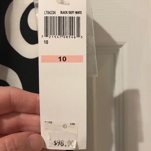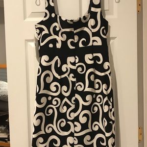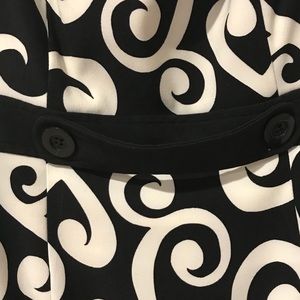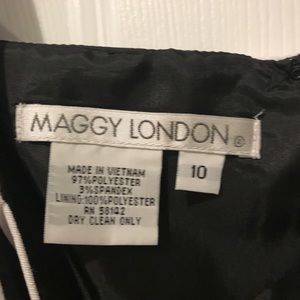 Black and soft white dress by Maggie London. Waist is accented with button detail. Zips in back. Dress falls just below the knee. New with tags. Size 10. Maintained in smoke free home.