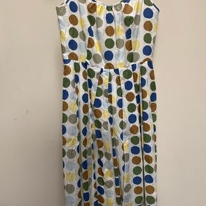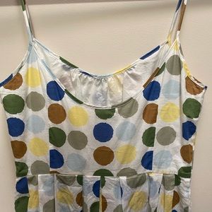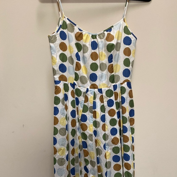 Polka dots are green, deep blue, pale blue, yellow, and crust
