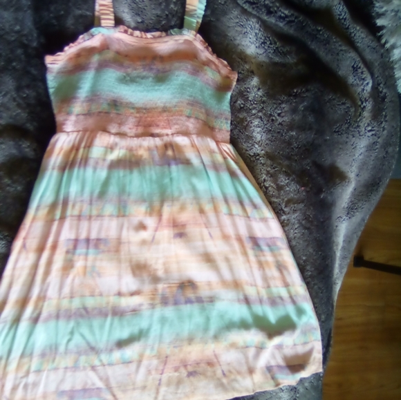 SUPER CUTE Sundress! Like New! NEVER WORN! No longer have tags because I thought I was going to wear it and ended up getting too far! LoL! Size is XXL on the tag. However, I would say it is more like a Large. Also, color is more of a baby pink and light sage!