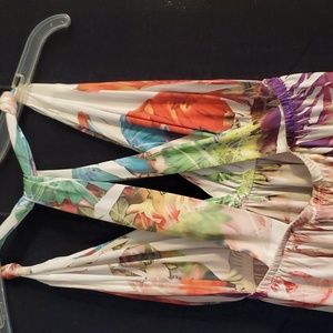 Pretty multicolor sundress has fun print and halter neckline. Back scoops down low to show off your tan.