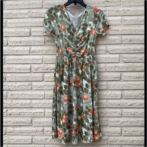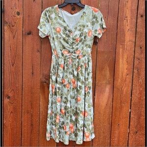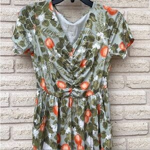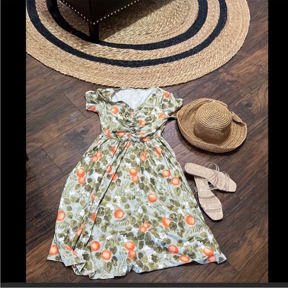 Orange/ art print dress. Perfect for spring/summer. POCKETS! Stretchy top/ waistline. Roughly knee length. Great used condition. * Hat and shoes not included
