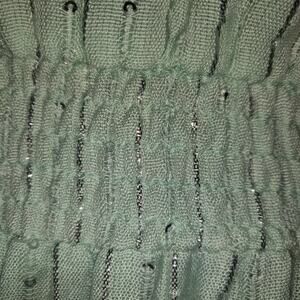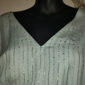 Although this may look blue in the main pictures, this is actually a pastel mint green that shows better in the close up pictures, those pics show the true color. Made by SUNDRESS, this is The Laura Dress and the color is described as Roma Pool. This is lined and lightweight, very flowy and feminine. Silver threading and tiny opaque sequins throughout.Side slits are 22" tall. The long sleeves also have slits. Elastic waist. Pullover to wear.