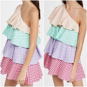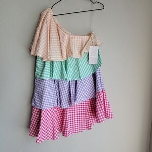 With its voluminous tiered design and 4 shades of gingham fabric, this one-shoulder SUNDRESS dress is sure to capture the spotlight