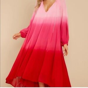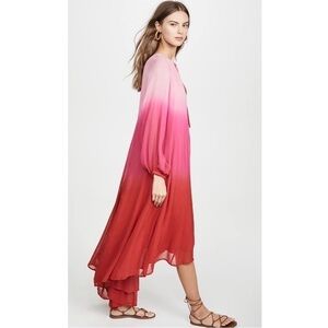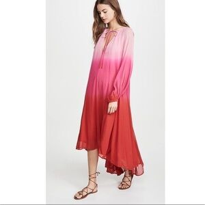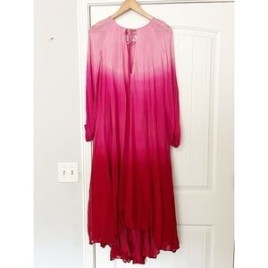 A floaty silhouette and a vibrant, dip-dyed hue makes this SUNDRESS cover-up a real standout when it comes to seaside options. Textured dress featuring round neckline, keyhole detail completed by an attached draw-cord, long bishop sleeves completed by elastic cuffs, and a flowy asymmetrical maxi hemline.