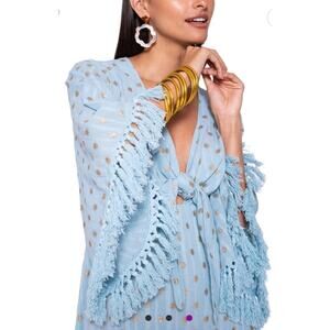 Embellished by sparkling suns, with a plunging V neckline, flared sleeves adorned with fringe, a side slit and elastic at the waist.