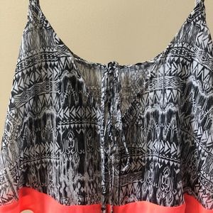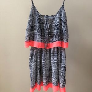 Black and white sundress with geometric print and hot pink trim, small tie in the center back.