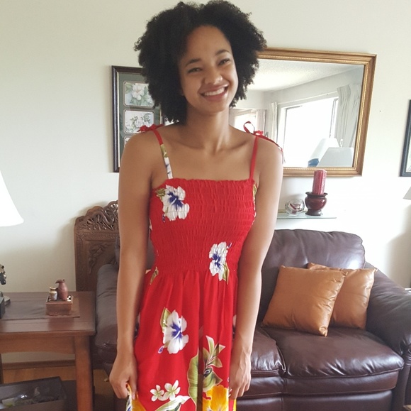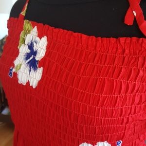 Beautiful sundress with bright colors. The top is 20" unstretched and 48" totally stretched. Model is 5'5" . The dress form in pic 3 is 40" bust. Dress is OSFM.