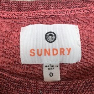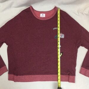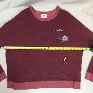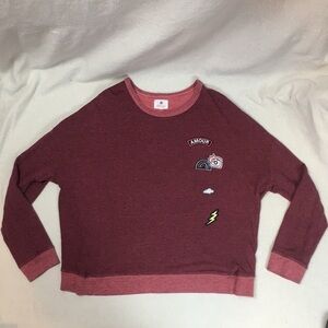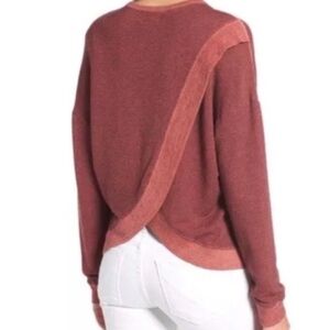 Super soft fabric- with cute patch details and crossover open back - contrast color at cuffs and neck - size 0 - gently worn, no flaws- loose fit - thicker than a tee, not quite a sweatshirt