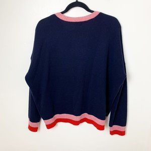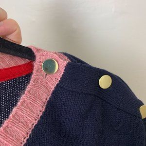 Love Button Sweater in Navy and Red with gold shoulder buttons. Light wear to buttons.