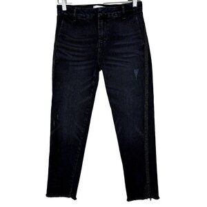 * Features: cotton blend, dark denim, cropped length, straight legs, glitter side tuxedo racing stripe, mid rise, distressed, raw hem, button and hook and eye closure, zipper fly, pockets, belt loops