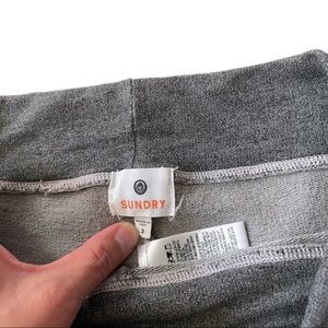 Sundry Soft, stretchy leggings perfect for yoga or lounging get a sporty twist from crackly stripes at one ankle. Featuring pop stripes printed in crackbinder ink. Crackbinder ink creates a unique, cracked print surface when pulled apart after curing. The weathered effect of this ink simulates a vintage, worn-in appearance. Small stain in the bottom right leg. Please see the photos carefully. Approx measurements taken lying flat.