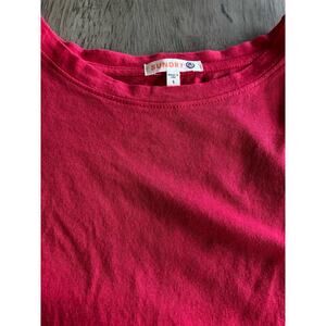 This knit top comes in a lovely red, it is the perfect basic to add color to your wardrobe. It is a soft, stretchy, lightweight Cotton/Modal blend. It features drop shoulders and a rounded neckline. The sleeves are a three-quarter length sleeve. The hemline has stitching all around but also features a tiny bit underneath the seam for a raw look. Sundry Size 1 fits a size 4-6 according to their size chart, please see the photo. New with final closeout tag.