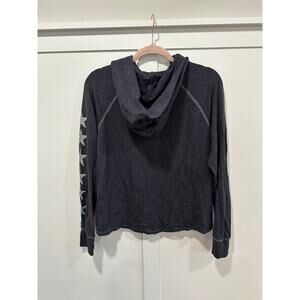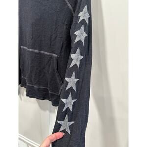Super soft. 66/29/5 viscose/cotton/spandex blend. Love the star graphic on the sleeve. Kangaroo pocket. Raw hem but it’s stitched so it won’t fray.