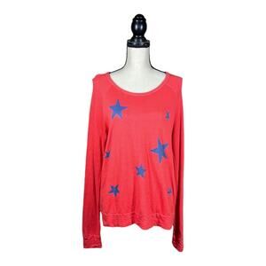 Sundry Stars Print Pullover in Chili in a size 2 Medium. Has a rounded neckline with banded cuffs and hem. Measures approximately 18 1/2" armpit to armpit, and 25" in length. 66% rayon, 35% rayon. In great condition.