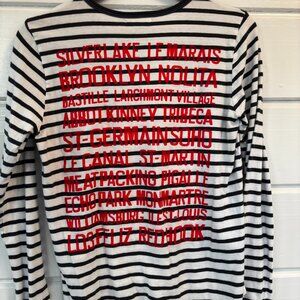 This unique SUNDRY long sleeve tee is crafted from pure cotton, and features a stripe motif that's overlaid with a list of neighborhoods at the back. Classic preppy and French stripe style with a modern/edgy update!