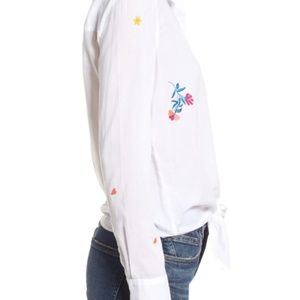 Bright embroidery adds playful detail to a crisp cotton shirt that will keep you smiling all day long. Worn once, in excellent condition.