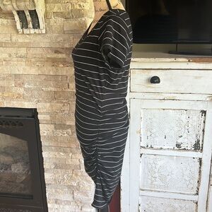 Good used condition Sundry black short sleeve t-shirt dress w white stripes. Crew neck. Flattering Ruching down side.