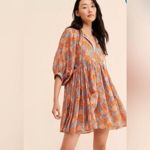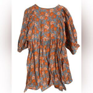 Chic floral mini dress by Sundry. Features vibrant orange and blue hues. Perfect for casual outings. Sold at Anthropologie. Armpit to armpit 19 inches. Shoulder to hem 31 inches.