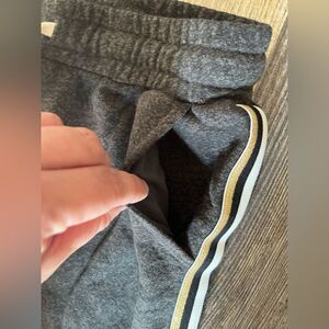 Comfortable black track pants. Features white side stripes. Perfect for casual wear or workouts. Slit at bottom!