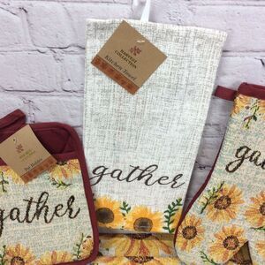 Add a touch of Fall and Thanksgiving to your kitchen with this 7-piece kitchen set from Home Collection. The set includes four rectangular placemats, one dish towel, one oven mitt, and one pot holder, all featuring a vibrant sunflower pattern. Made from a durable cotton blend tapestry material, this set is machine washable for easy cleaning. Perfect for any occasion, this multicolor set will bring a sense of warmth and gather to your dining table. Made in India, this set is a must-have for any kitchen.