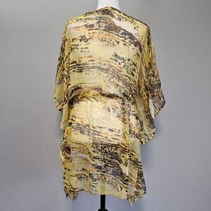 Sunflower brand women's sheer kaftan cover-up in a flowy boho style. Features a lightweight, semi-sheer yellow and brown abstract print, wide sleeves, scoop neckline, and adjustable drawstring waist. Perfect as a swimsuit cover-up, resort wear, or layered festival piece. New with tags. Small flaw noted near the front shoulder (see last photo)—still very wearable and priced to reflect. Tagged "Free Size" with a relaxed, oversized fit.