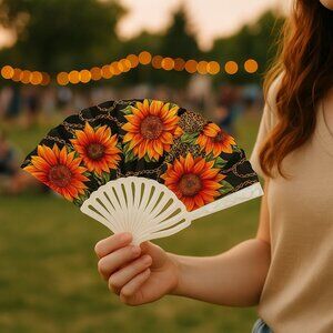 Sunflower & Daisy Folding Hand Fan with Leopard Accents