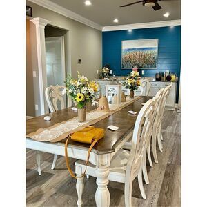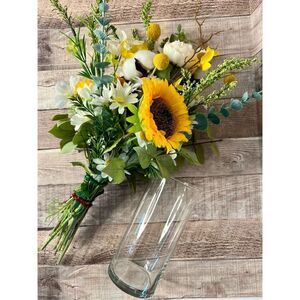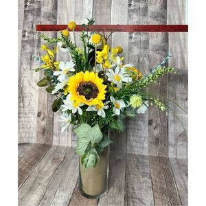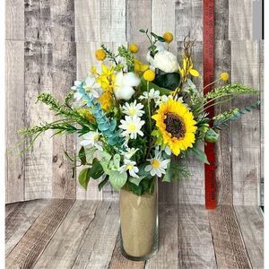 Sunflower Daisy Eucalyptus Floral Arrangement Perfect for Baby Wedding Shower, Birthday, Anniversary, Reception, Family Reunion. The options of use are endless. Comes with flowers and glass vase you see in individual arrangement photos. Sand is NOT included. Too heavy to ship. Used once. Item in excellent gently used condition. No known rips, tears, holes, stains or defects. Approximately