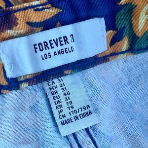 Blue and yellow sunflower print cotton jean shorts in size 31