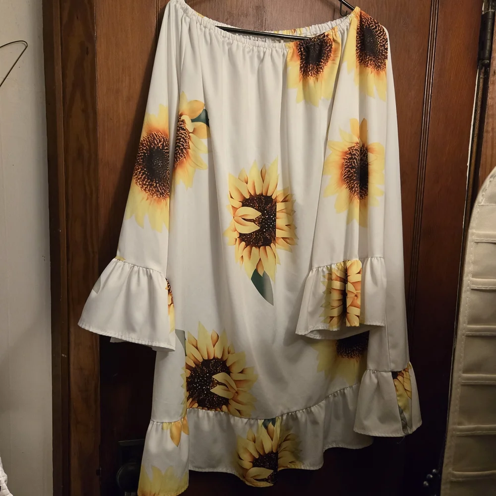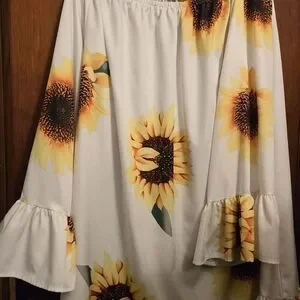 Off-shoulder tunic with bright sunflower print. Lightweight fabric with ruffle sleeves and hem. Cheerful yellow floral motif on a white base. Easy, breezy summer piece.