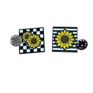 Sunflower Pin Set of Two in vibrant yellow, black, and white colors. Beautifully crafted to add a touch of nature-inspired beauty to your outfit. Ideal for personal use or as a lovely gift.
