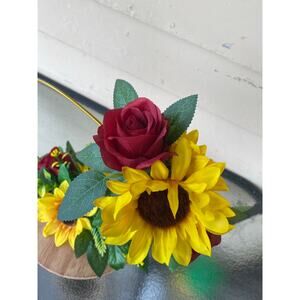 Brighten up your space with this unique sunflower & rose hoop wreath 🌻🌹. Made on a modern gold hoop base with bold yellow sunflowers, deep red roses, and lush greenery, this piece is perfect for year-round farmhouse style décor.