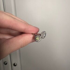 Modern and fresh, this beautiful bypass ring features two blooming sunflowers that sparkle with gemstone centers. Made with a diamond and peridot, the birthstones for April and August, respectively. Made in 14k white gold. Purchased from the website for JEWLR and never worn outside of being tried on. There was an inscription I have had lasered off. Size US women’s 5. Made in American or Canada per the website. I will include the ring box as well.