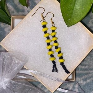 Sunflower Yellow Hand Crafted Macrame Tassel Fringe Earrings Wood Beaded Accents
