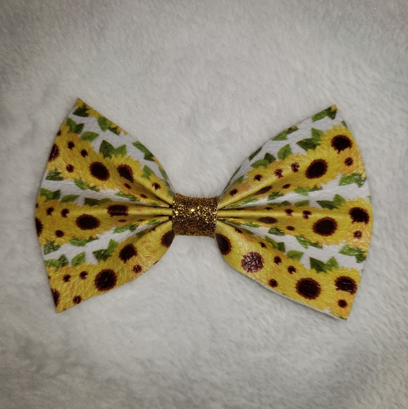 Handmade faux leather sunflower bow. You can choose between alligator clip or nylon band.
