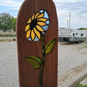 Stained glass sunflower in walnut 8.5x19.5 inches black patina wood stand 3 in stock