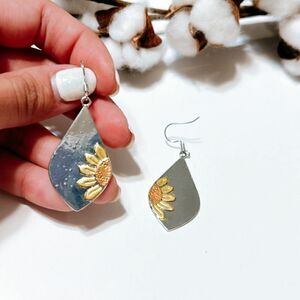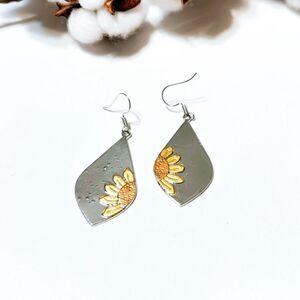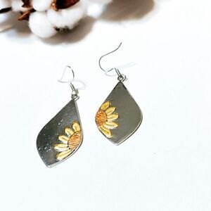 Sunflower print dangle earrings in silver tone
