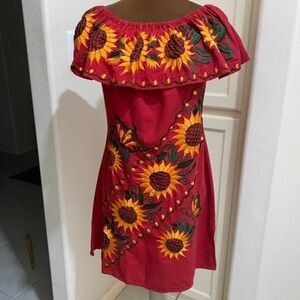 Sunflowers embroidery Mexican Red Woman's Dress Size Small