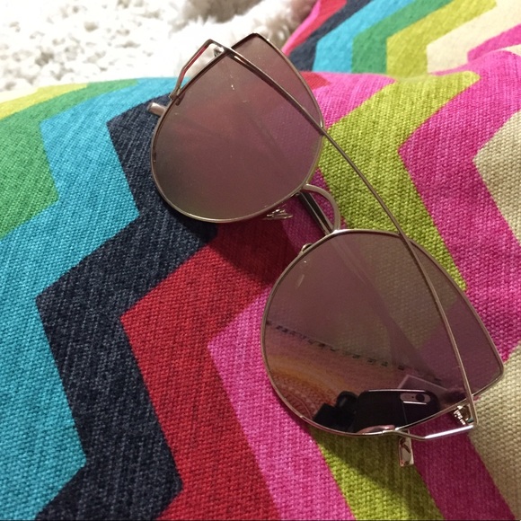 Rose gold reflective sunglasses. Cat eye shape with gold outlining. These sunglasses run a little big for me, but they could be perfect for you!:)