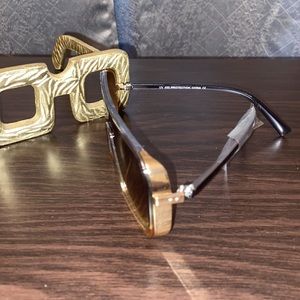 Rectangular sunglasses with two-tone lenses and gold side blinders