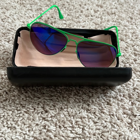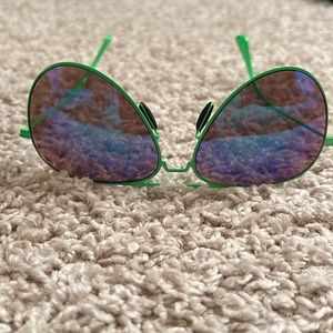 Metal green framed sunglasses with purpleish blue colored lenses. Great for accessorizing any outfit.