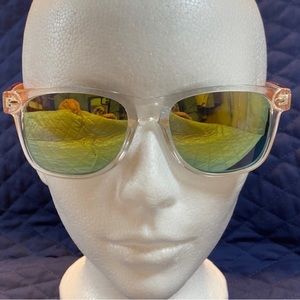 Sunglasses Clear & Orange Frames. Golden-Green Mirrored Lenses.