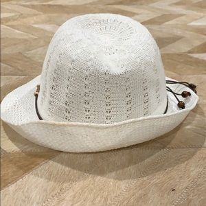 White sun hat, beaded tie around