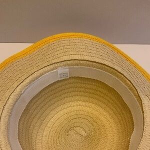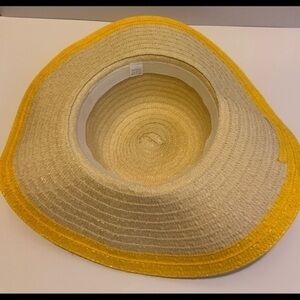 NWOT sunhat. 100% paper. Yellow trim, 4” height. Floppy medium size sunhat. Standard size, one size fits most. Pairs great with a sundress or bathing suit. Manufacturer defect shown in forth & fifth photo. (Snag and some discoloration) No trades. Smoke free and Pet free environment. Thank you!